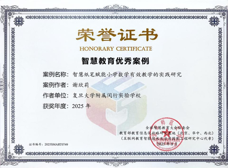 近日,在教育部科学技术与信息化司指导下,教育部教育信息化战略研究基地(北京、华中、西北)于全球智慧教育大会上正式公布了2025年度智慧教育优秀案例评选结果。上海市闵行区共有62项案例获奖,我校谢欣莉老师的案例《智慧纸笔赋能小学数学有效教学的实践研究》成功入选,彰显了我校在教学数字化转型中的前沿探索与扎实成果。