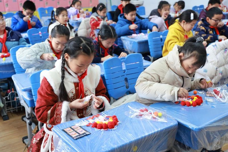 下午1点,“马到成功”系列活动正式开启。各年级教室变身“传统文化体验坊”,红包拓印、节气装饰画、福袋制作、编织小马、小马挂件制作、漆扇、京剧脸谱和青铜器装饰画制作等八个特色项目有序开展。孩子们专注地蘸取颜料、折叠彩纸,灵巧的小手让传统工艺焕发出童真童趣。